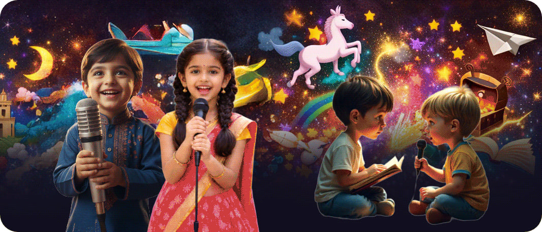 சொல்லலாம். ஆனா, நீதிநெறிக் கதைகள் சொன்னா நல்லா இருக்கும். அப்புறம், சினிமாக் கதையையெல்லாம் நம்ம செல்லங்கள் சொல்ல வேணாமே... தூய தமிழ்லதான் சொல்லணும்னு இல்லை. Tanglish-லகூடச் சொல்லலாம். மழலை மொழிதான் முக்கியம்.